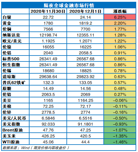 上一交易日,中美制造业数据向好,美国三大股指集体收涨,纳指、标普500创新高、欧洲股市全线收涨、亚太股市多数上行。富时中国A50期货沿5日均线稳步上涨1.76%,继续拉升。美债收益率集体上涨。美元指数继续加速下行,纽约尾盘,跌0.93%,收91.1801。受伊朗科学家和高管陆续被刺杀等消息影响,中东局势再添变数,市场避险情绪再起,黄金大涨2.15%,收1819.2美元/盎司。美油收跌。外盘金属涨跌不一,伦铜创新高,伦铝高开高走。ICE和CBOT农产品主力合约涨跌不一。
