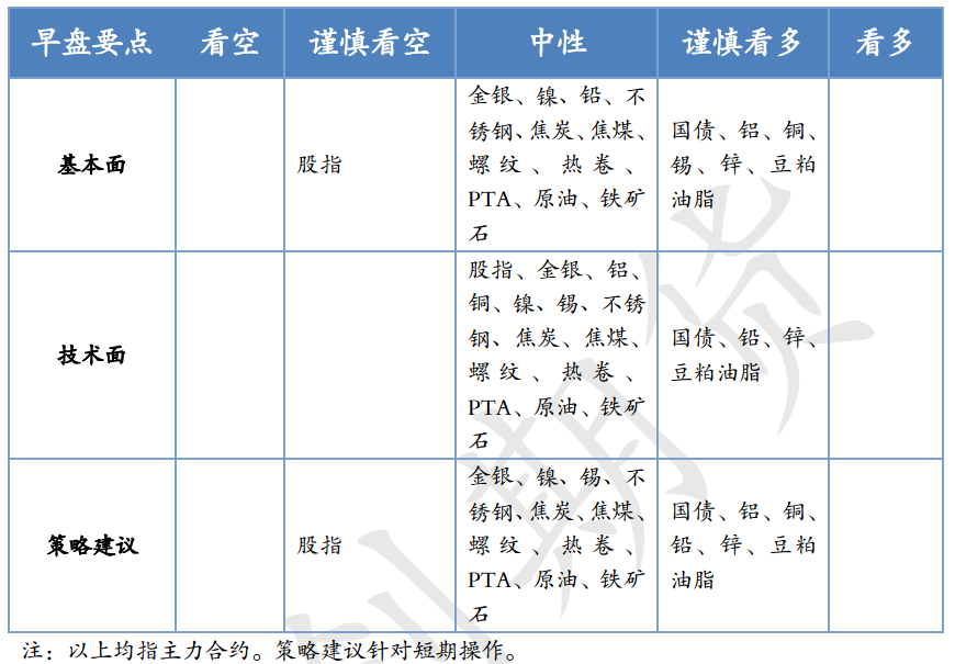 上一交易日,美国三大股指收盘涨跌不一;欧洲和亚太股市涨跌互现。富时中国A50期货低位震荡。美债收益率多数上涨,10年期美债收益率涨1.6个基点报1.635%。市场风险偏好走高,美元指数继续回落,非美货币多数上涨。国债收益率的上涨降低了黄金的投资吸引力。COMEX黄金价格走低。美国上周EIA原油库存大减589万桶,连续第三周下降,推动油价收于3月中旬以来的最高水平。美元指数继续回落,外盘金属全线走高,LME铝再创新高。ICE农产品主力合约多收涨全线收涨;CBOT农产品主力合约涨跌不一。